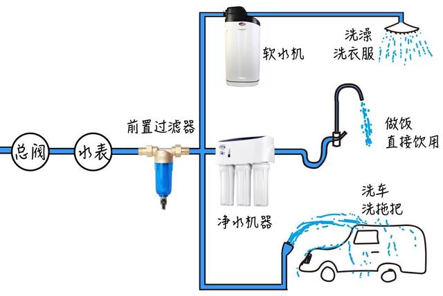 心思周到的小伙伴,早就开始考虑前置过滤器+净水器+软水机等一系列设备了,从源头杜绝污染水进入家门。