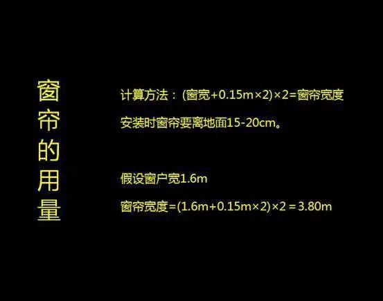 注:普通窗帘多为平开帘,首先根据窗户的规格来确定窗帘的大小,其次窗帘要盖住窗框左右各0.15m,并且打两倍褶。