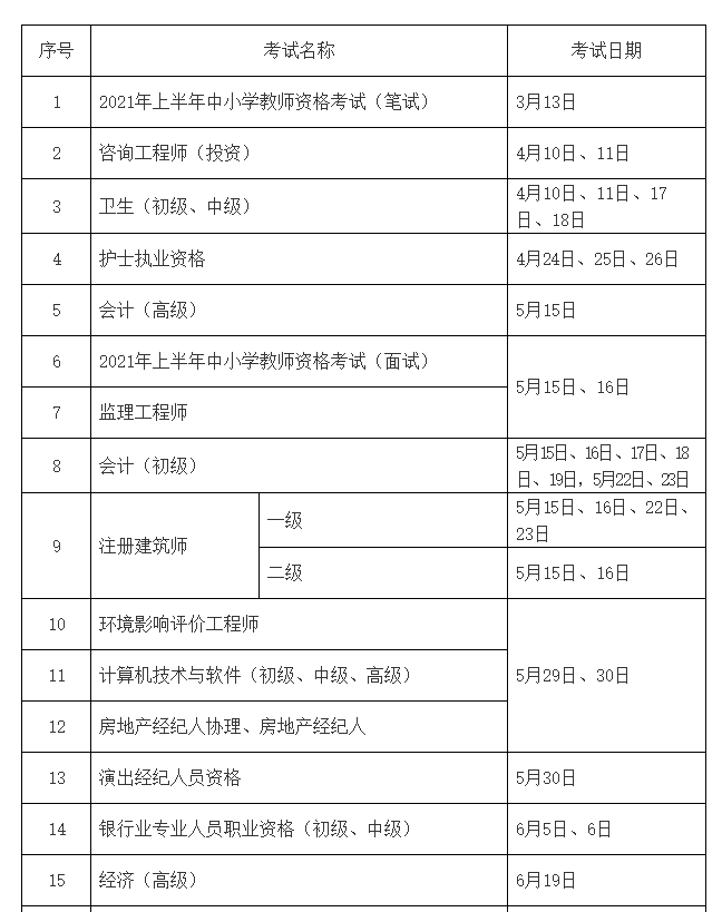 一、请按照《2021年度专业技术人员职业资格考试工作计划》(见附件)做好各项考试组织实施工作。2021年下半年中小学教师资格考试日期由主管部门另行通知。专业技术人员计算机应用能力考试日期由各地自行确定。